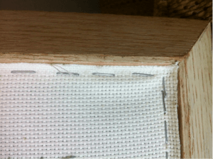 I found the special cross stitch fabric in a big roll at ARC for $1.99 and then I found the frame for $2.50. I started by stretching the fabric behind the frame and stapling it with a small staple gun to the edges of the frame.