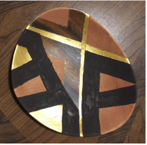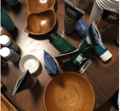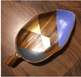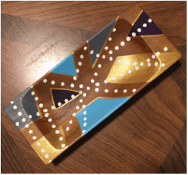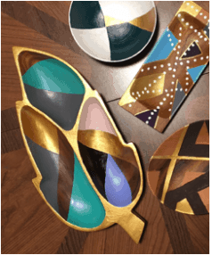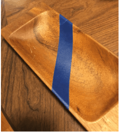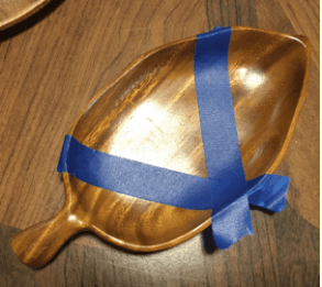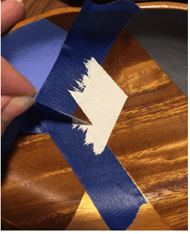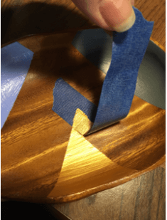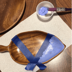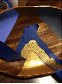 We all started by taping off different sections of our bowls or trays in order to create color-blocking sections for the paints. Some of us created tons of tape divided sections while others chose to only make a couple, keeping in mind that anywhere we had tape would be bare wood when we pulled it off.