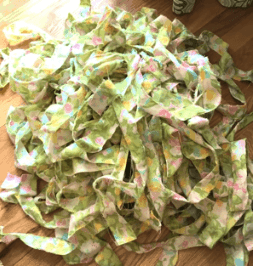 Once I had a huge pile, I selected one strip to be my main piece of “string” that would go across the top of the garland and would have all of the other strips tied to it.