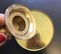 In order to make the tins tiered and to increase my storage capacity, I bought two brass candlesticks from arc at $.99 and $1.99. One was heavy, so I used that for the bottom tier to help make it steady and the other lighter one I used for the second tier.