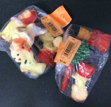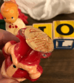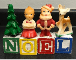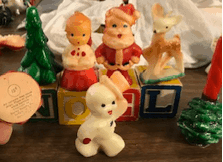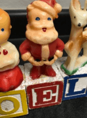 My latest treasure bag find was these vintage Gurley candles. They are fun, figural, Christmas shapes and little guys. The price was right at arc with one bag at $.99 and one at $1.29. I wasn’t sure how to best display these so I wandered around arc for inspiration.