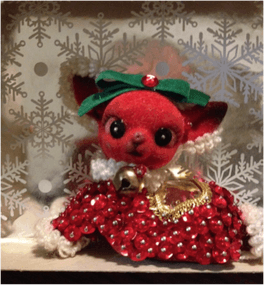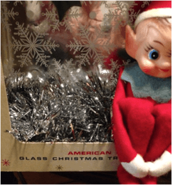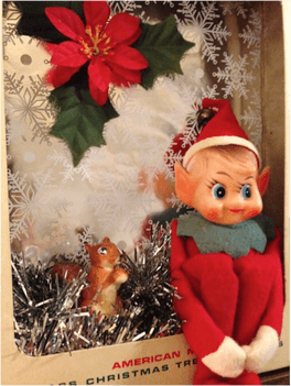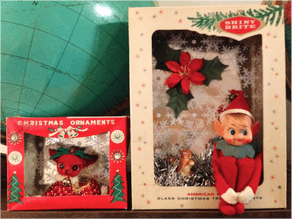 The other one got more details: a faux flower glued up high, a vintage elf from ARC (another treasure from one of their bags), and some garland.