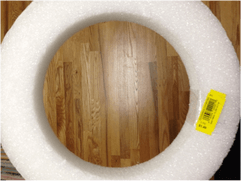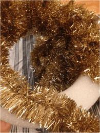 My first step was to wrap a tinsel garland around the entire wreath form. I didn’t want any white styrofoam peeking through. Using hot glue I secured one end and then wrapped the whole thing and glued the other end to make sure it wouldn’t unravel.