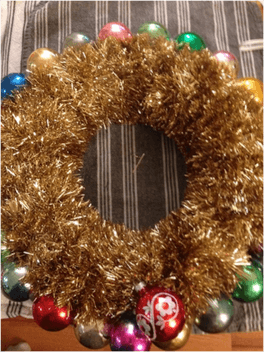 After that I started gluing the larger, plain globe ornaments all around the outside edge. (Good thing I was able to find so many at ARC-this wreath took a lot of them.) This project is all about the glue gun; everything is secured with hot glue.