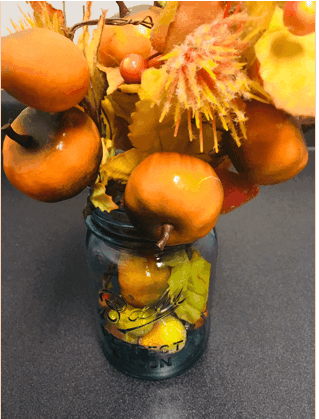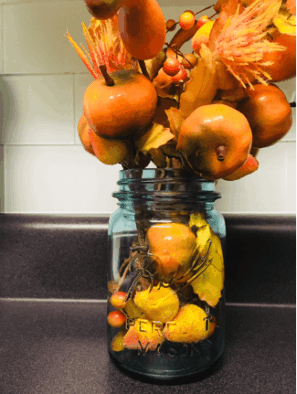 My favorite option for the table is this blue mason jar ($1.99 at arc) filled with fall-themed floral picks ($2.99 for a whole bag of them).