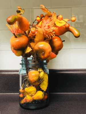 The floral picks have mini pumpkins on them, gourds, leaves and fruit. The bright fall colors look really great with the blue glass.