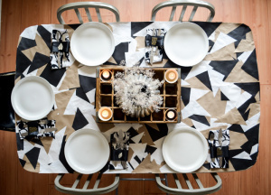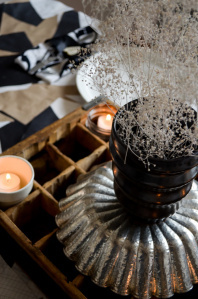For the rest of the table, I was also able to thrift some black ribbon, white candle holders, dried white flowers, a black vase, beads and gold jewelry, black and white fabric to make napkins, and a metallic fluted pan. I used the ribbon around the base of my wood crate, and for napkin rings. The gold jewelry and beads were also used on the napkin rings, and I used the fluted pan and black vase to create height in the center for the dried flowers.