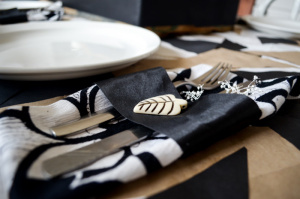 Before I went to the thrift store to pick out my supplies, I first came up with my color palette. I chose black, white, brown, and metallic for my theme and set off looking through the store.I started thinking about a tablecloth, and I knew I wanted to do something non-traditional. I headed over to the stationary and office supply aisle (one of my favorite sections of the store) and found black paper, brown mailing paper, a roll of wallpaper, and a really cool black and white calligraphy practice pad.