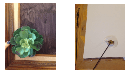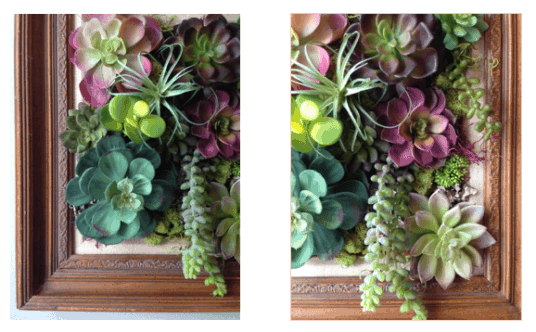 I colored the foam core black so that it wouldn’t stand out as much between the faux plants (though I’d recommend painting it instead, due to the marker fumes). Then came the fun part: I took fake succulents and started arranging them on the foam core. When I found an arrangement I liked I pushed the stem through to the back and glued or taped it into place.