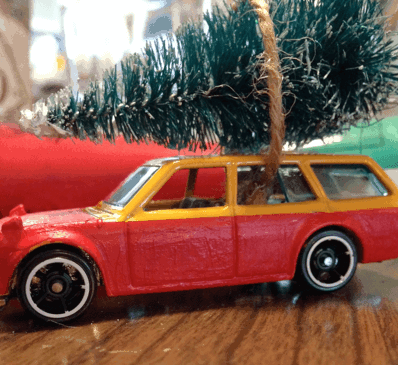 My next step was to round up some winter miniatures. I had a tiny ceramic deer from ARC and a toy car that I painted to cover up the racing stripes. On the miniature car I glued a small tree and then wrapped a piece of twine around it.